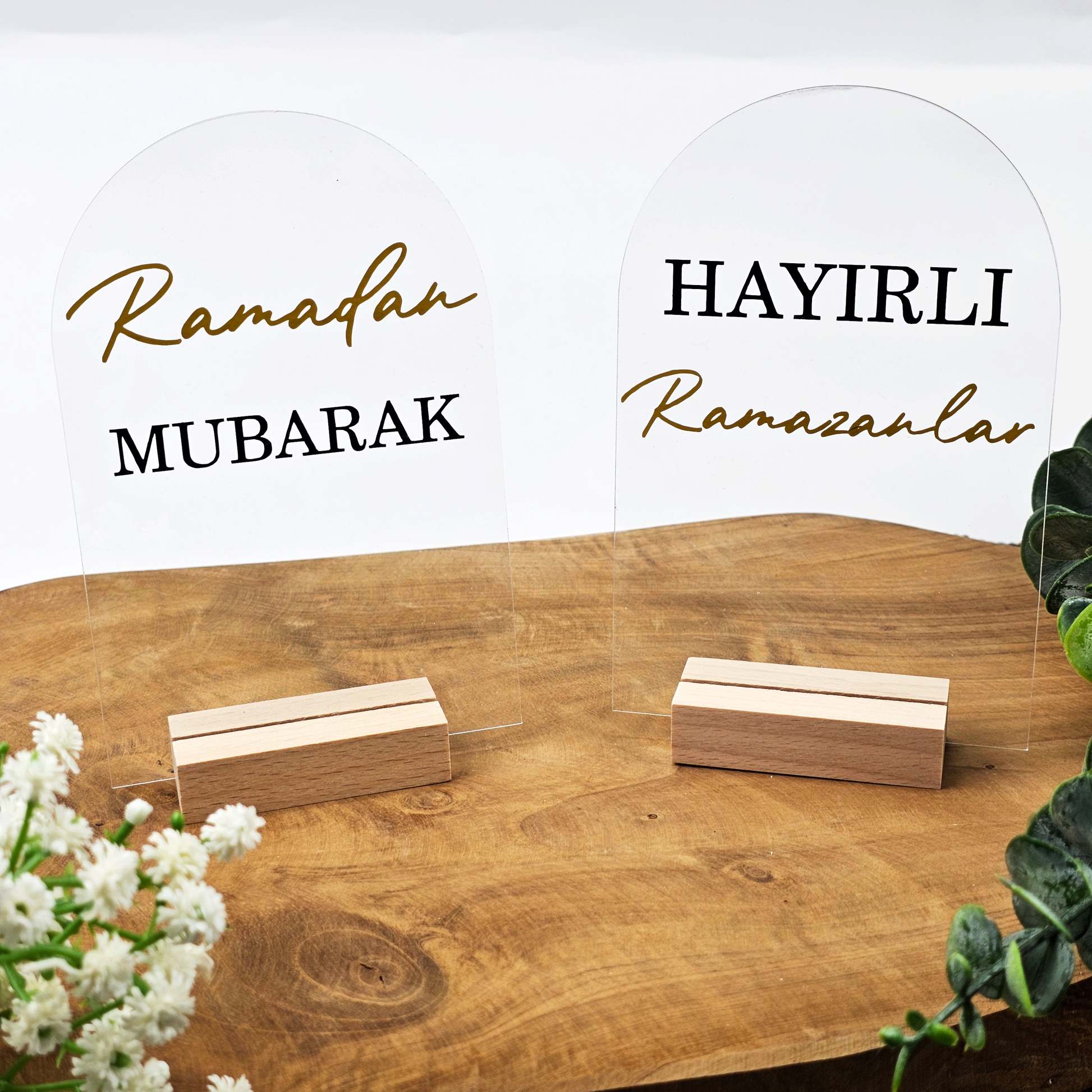 Ramadan Acrylschild mit Holzfuß | Bayram Deko | Eid Mubarak Tischdeko | Islamische Geschenkidee (Hayirli Ramazanlar)
