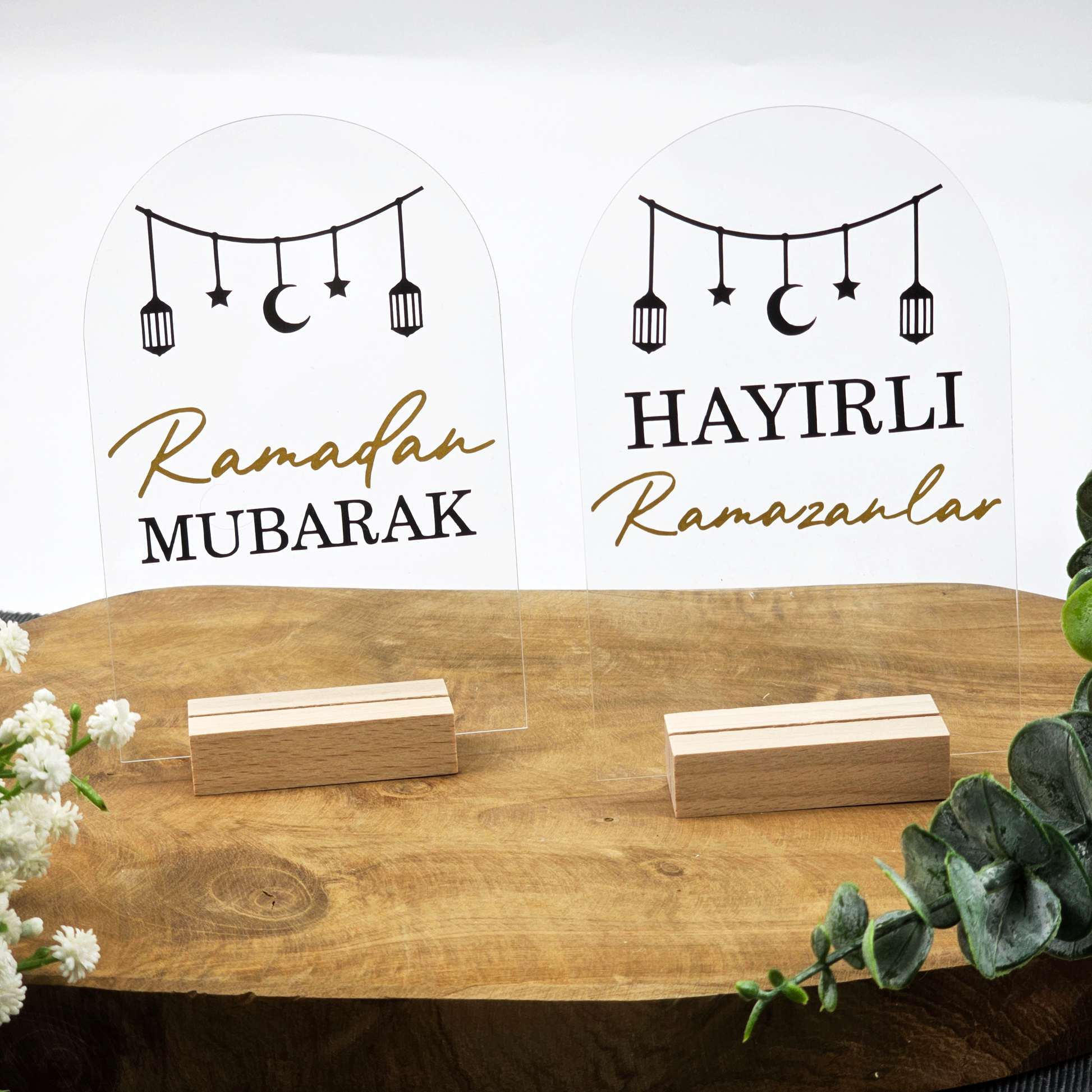 Ramadan Acrylschild mit Holzfuß | Bayram Deko | Eid Mubarak Tischdeko | Islamische Geschenkidee (Ramadan Mubarak Girlande)